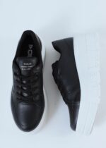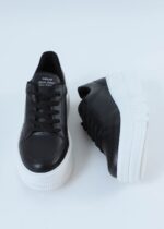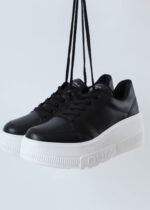 • Sola: Alta e robusta, em branco, oferecendo conforto extra e um contraste moderno com o corpo preto do calçado.